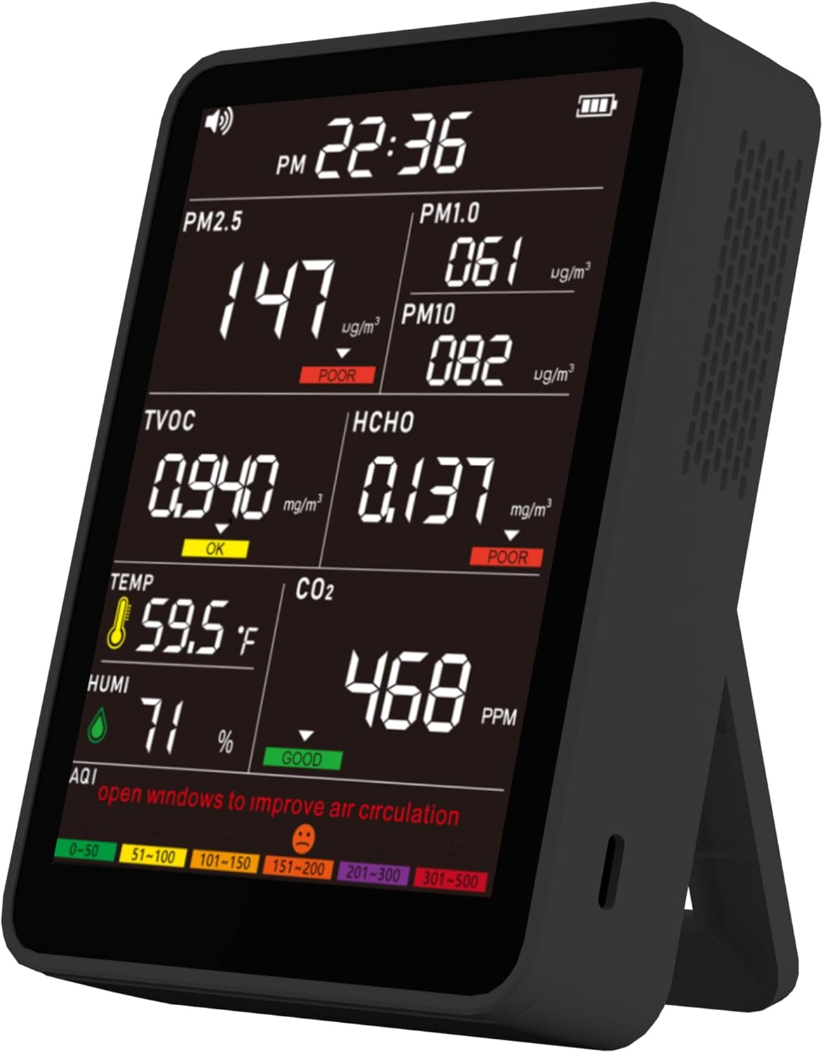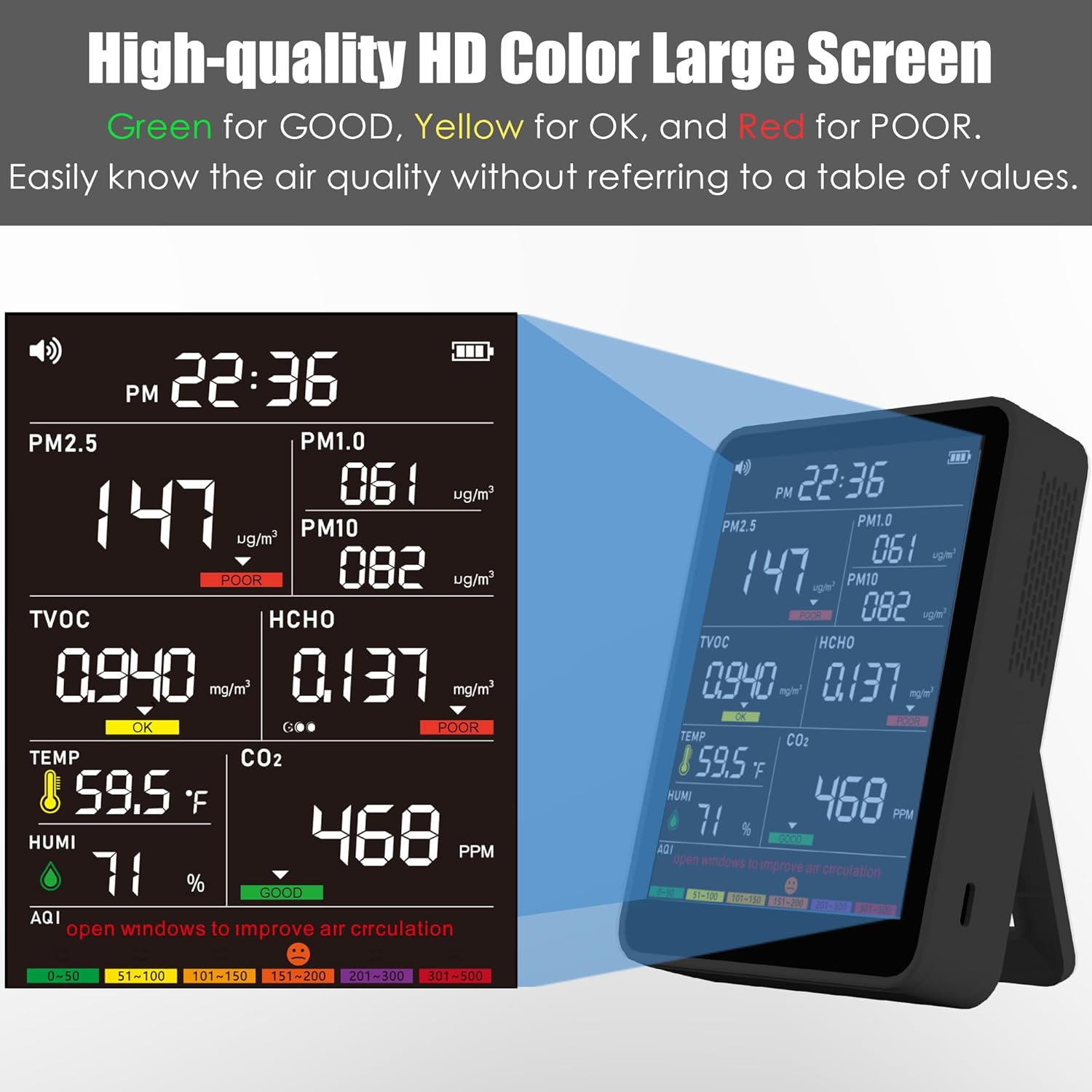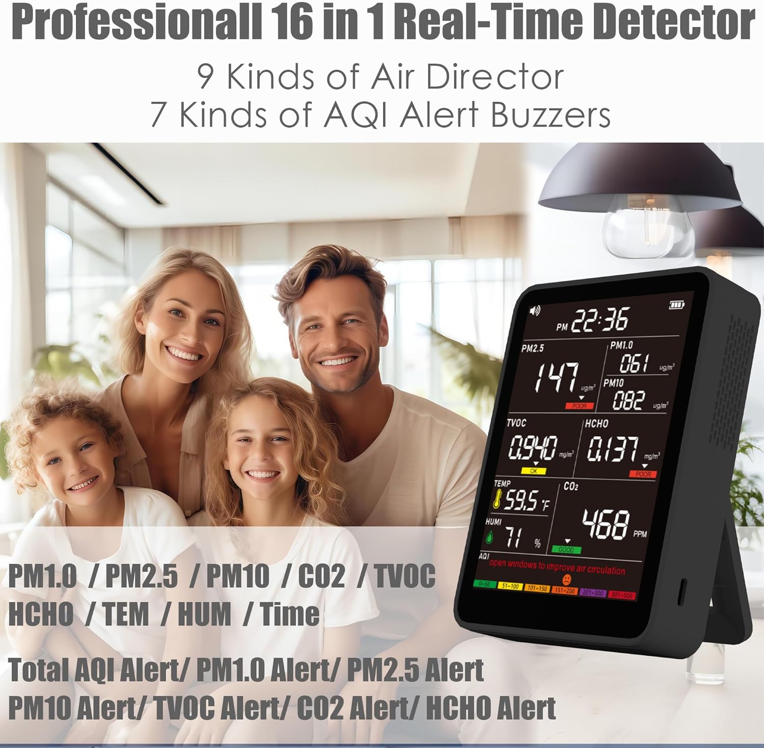 16-in-1 Indoor Air Quality Monitor is a professional-grade, portable real-time detector designed to assess the air quality in various environments, including homes, cars, plants, and spaces with pets. This advanced monitor includes 9 AQI (Air Quality Index) sensors, providing detailed insights into the level of pollutants in the air, such as particulate matter (PM2.5, PM10), CO2, VOCs, formaldehyde, and more. Additionally, it features 7 AQI alert buzzers, offering timely notifications when the air quality exceeds safe levels, ensuring that you can take immediate action to improve the environment. Whether you’re concerned about air quality in your home, workplace, or vehicle, this monitor is an ideal solution to protect yourself, your family, and your pets from harmful pollutants. Compact and easy to use, the device offers real-time measurements and allows you to make informed decisions to create a healthier, more comfortable living space. Perfect for anyone seeking to maintain optimal air quality in their surroundings.