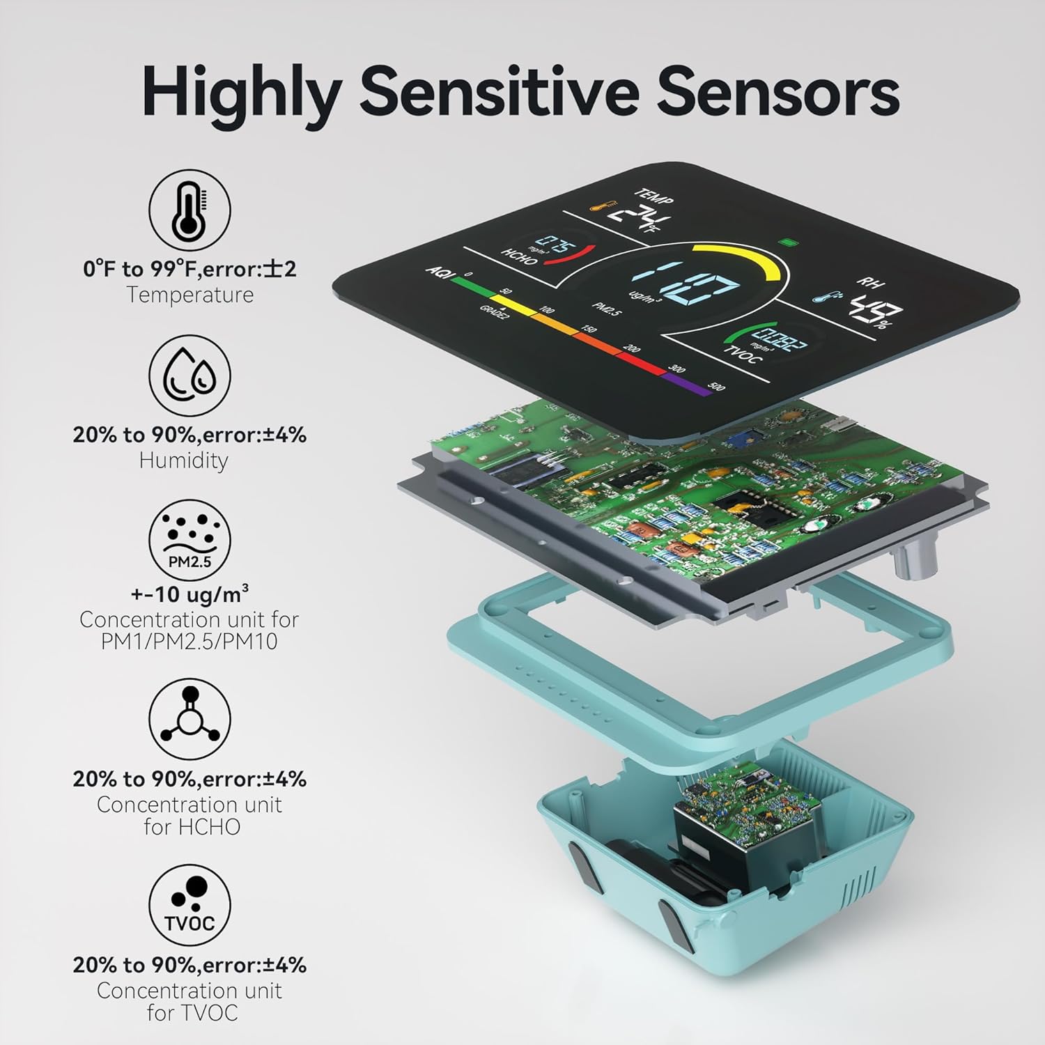 - [Colored Display Date & Easy to Read]: Each value is shown in its own color(green/yellow/red), making it easy to determine whether the current air quality is healthy. All data is displayed independently on a high-resolution color screen. The displayed numerical measurements are clear and easy to read.
