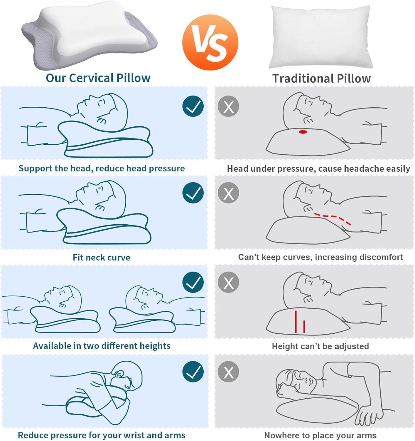 - 2 Personalized Height for Any Sleep Style: Our ergonomic pillows are available in two height options with size 26.4*13.8*5.3/4 inches (L x W x H). The orthopedic and supportive pillow for neck and shoulder pain is designed for multiple sleeping positions, such as side sleeping, supine, stomach sleeping, back sleeping and low pillow sleepers etc.