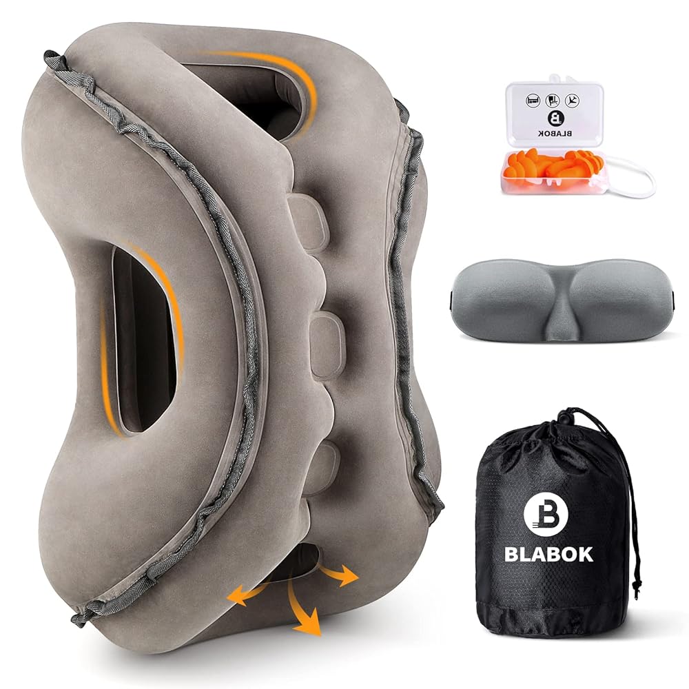 I love to travel, but cannot sleep on a plane. I have to have my head forward, and this pillow really helps to grab a few winks. It’s comfortable with places to wrap your arms around or through it and can be angled in many ways also by increasing or decreasing the amount of air, you can find a desired And fit the face hole opening has a slight bit of an edge to it. I found by adding a small face cloth. I was able to use this pillow please note this is not different from others on the market. They all have a little bit of an edge inside it’s more than tolerable, but I do suggest adding a small face towel to air out before you there is a bit of gas when you initially open the package but leaving it gets rid of it. It’s very simple to inflate took about 15 deep breaths and easy to deflate and get back into the bag provided which could be slightly bigger, but it does work. They also provide a few extras like an eye mask And earplugs bonus
