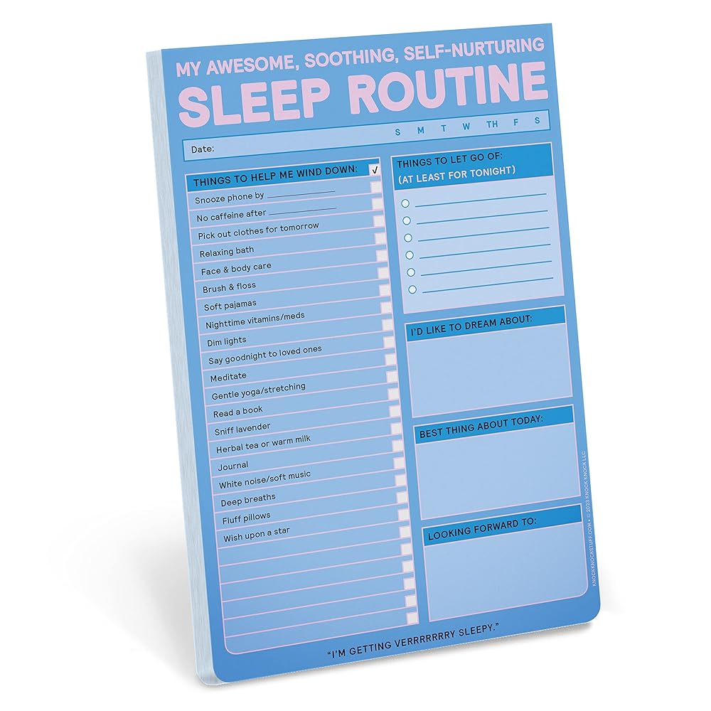 - Knock Knock Sleep Routine Pad is your ultimate tool for cultivating a soothing and self-nurturing bedtime routine. Designed to help you unwind and achieve restful nights, this 6 x 9-inch sleep tracker and checklist pad is a must-have for anyone looking to improve their sleep quality. With its thoughtfully curated sections, the Knock Knock Sleep Routine Pad encourages mindfulness by allowing you to track your nightly habits, log sleep goals, and prioritize relaxation techniques.