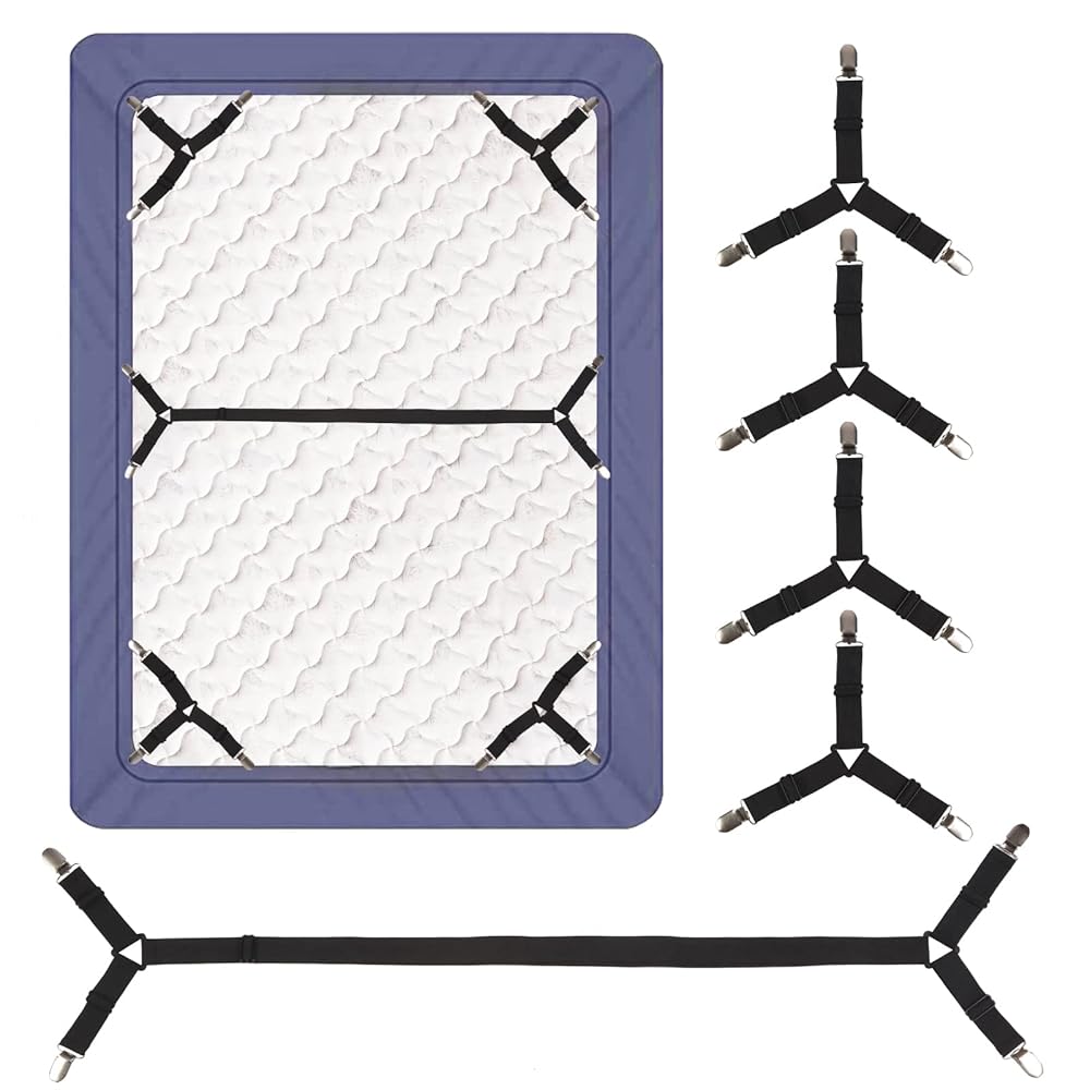 - Upgraded Design: 4 Pcs 3-way Triangular Sheet Holder Straps to Securely Hold Each Corner of the Sheet in Place and 1 Pcs 2-head Straight Sheet Strap for the Middle of the Sheet, with This Extra Straight Bed Clip, You Will No Longer Worry About Edge Separation, the Unique [4+1] Set of Sheet Straps Provide a More Stable Sheet Fixation, Ensuring Your Bed is Perfectly Tidy, Never Worry About Messy or Wrinkled Sheets Again.