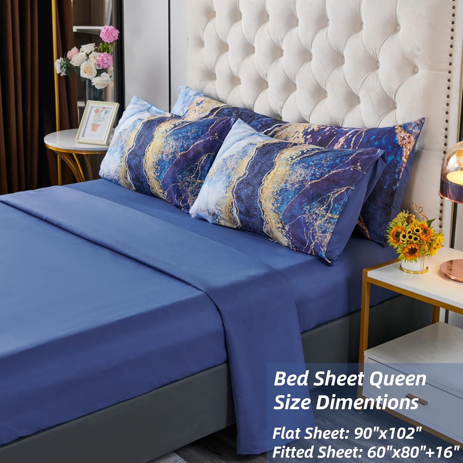 - Queen size PERFEMET 6 Pcs Bed-in-A-Bag Blue Watercolor Marble Printed Comforter Set include: 1 Comforter: 90″x90″, 1 Fitted Sheet:60″x80″+16″, 1 Flat Sheet: 90″x102″, 2 Envelope Pillowcases: 20″x30″, 1 Body Pillow Cover 20″x54″, perfect for a queen size bed.