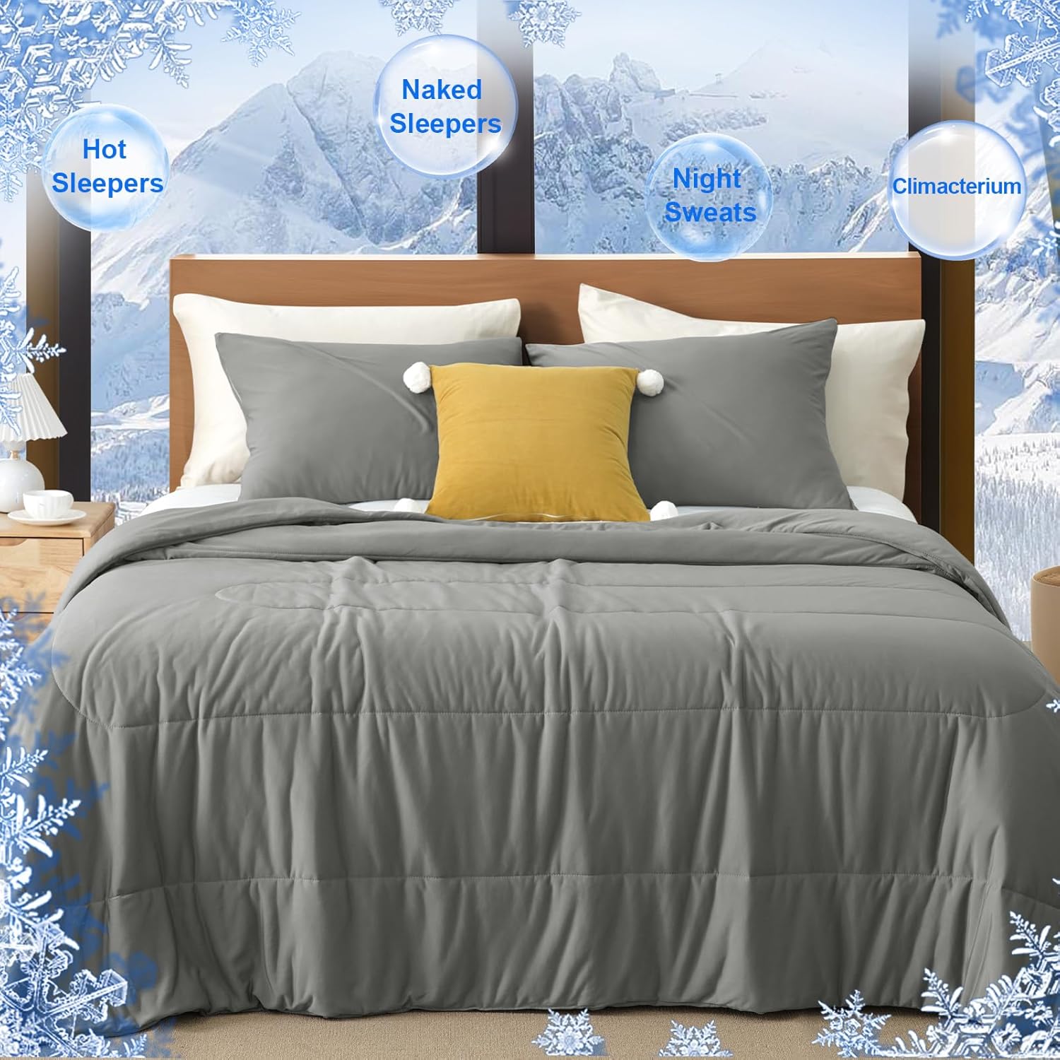 - What You Can Get: 3 pack ultra cooling comforter sets includes: 1xcomforter 90″x90″+ 2xpillowcases 20″x26″. Our pillowcases are also made from cool fiber fabric that’s refreshing on both sides. Enjoy the perfect level of coolness against your skin without worrying about messy hair or sweat, and stay refreshed all day long.