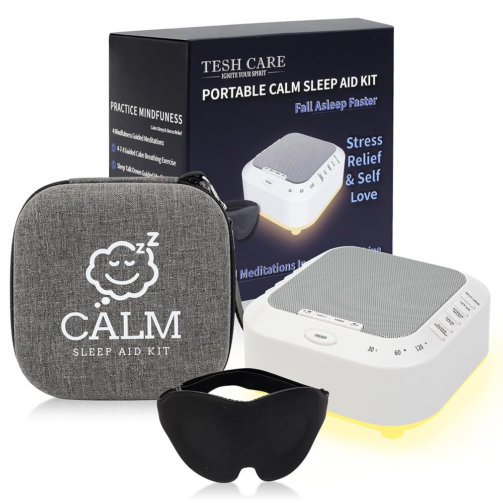- âś…RESTFUL SLEEP WITH TESH CARE CALM SLEEP AID KIT–3 IN 1 Designed with sleep sound machine, voice guided meditations, and 3 D sleeping mask to help you to achieve best sleep and relaxation.