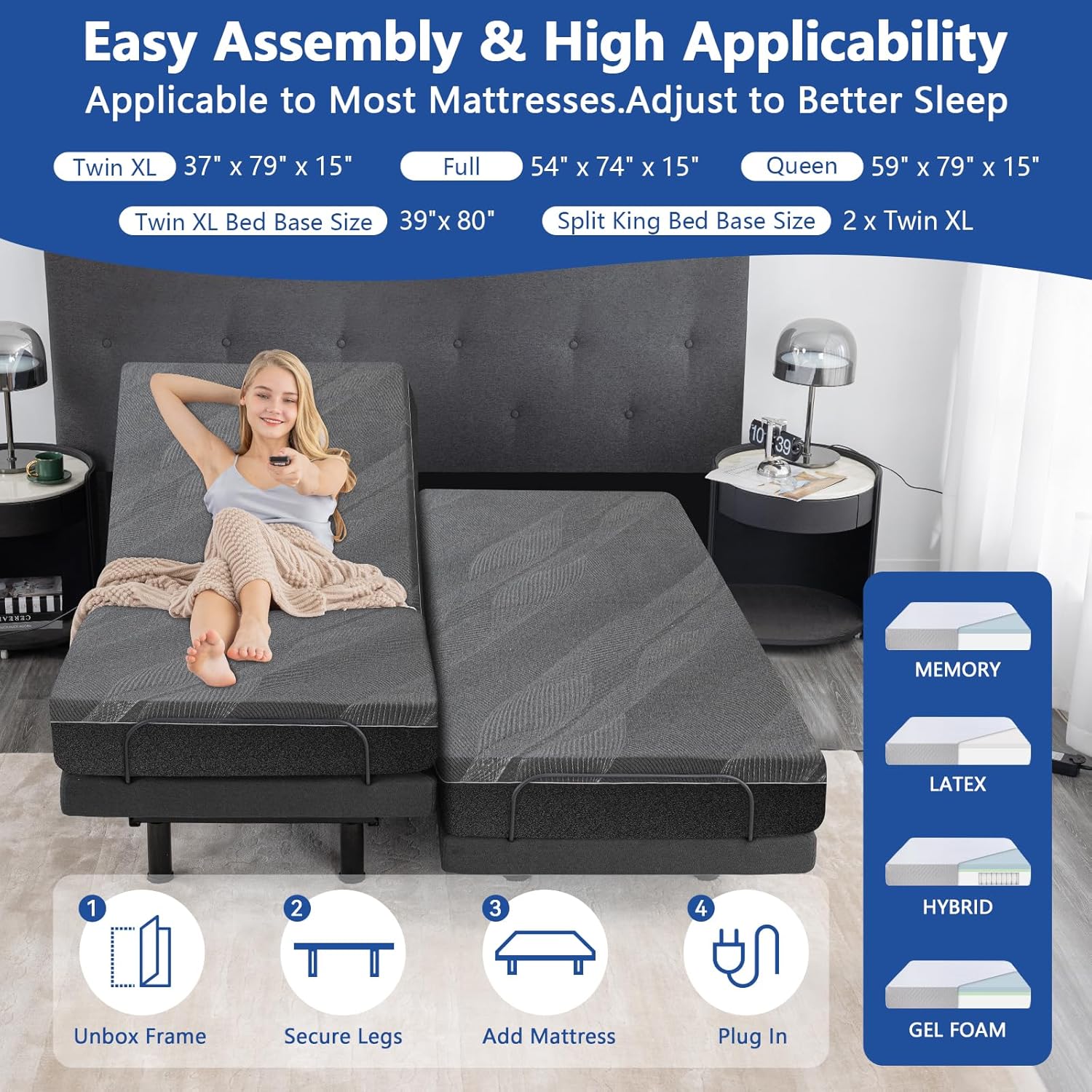 Memory preset positions, adjustable leg height, and multiple angle adjustments enjoy a more convenient and safer bed life. My favorite part is the ability to independently raise the high head and legs, perfect for watching TV shows and reading books in bed!