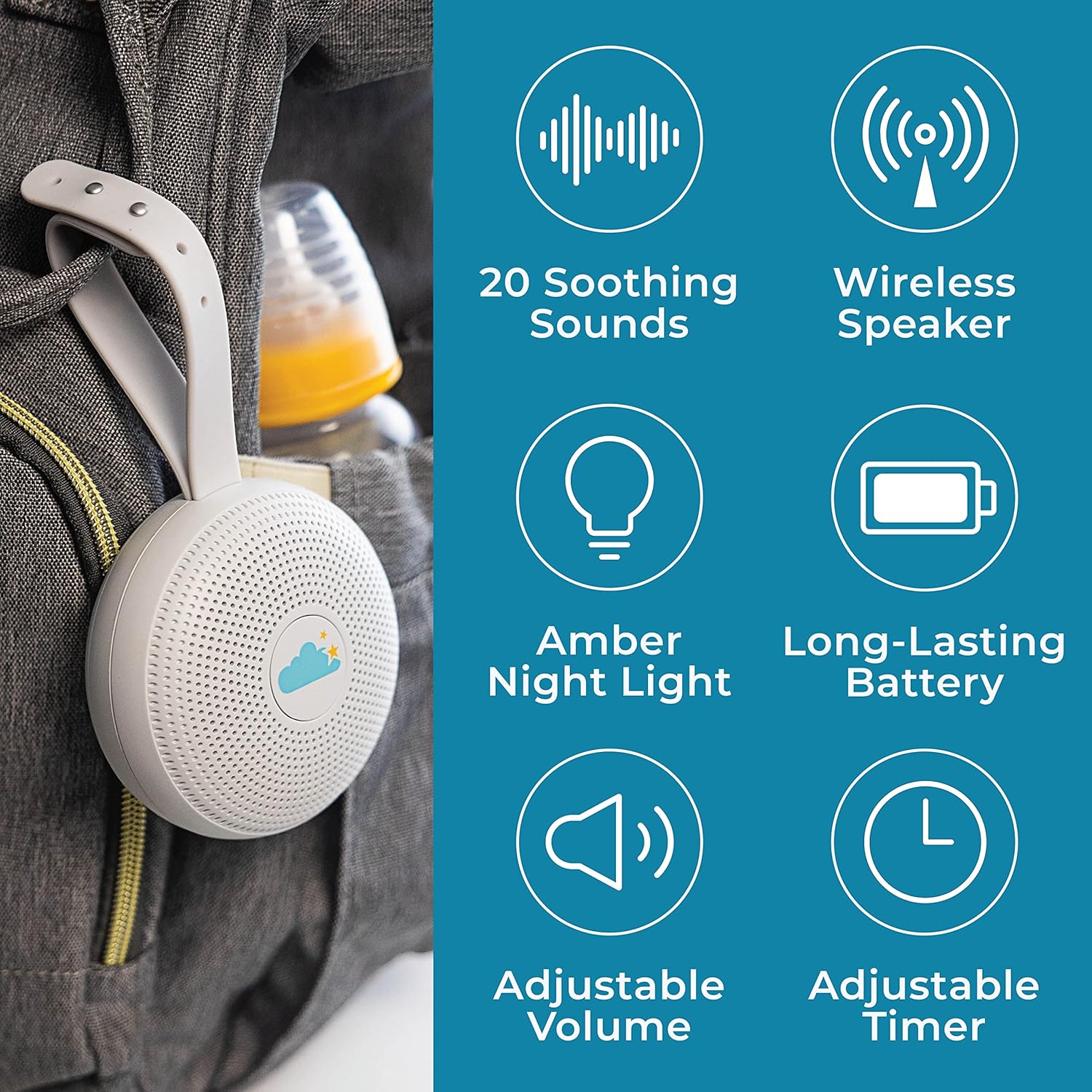 The included light is such a helpful feature – especially for those middle of the night diaper changes. Volume range is great and has incredible battery life. Wide Variety of sounds
